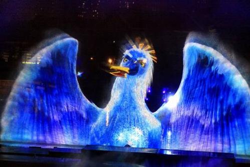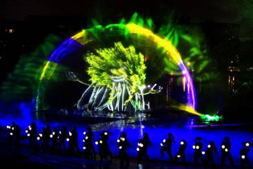据悉,该剧场采用了5台全球最亮的35000流明的科视Roadie HD+35K 投影机,和2台配合科视Nitro YK200摇臂的20000流明的科视Roadster S+20K投影机,在横跨120余米的水幕舞台上,根据舞台风格形状进行投影和图像融合,影像可瞬间转换,非常灵活;并配合数控升降系统对舞台道具“月亮”进行跟踪投影,“月亮”徐徐升起,又徐徐降落,非常逼真。35000流明和20000流明的超高亮度投影,更是令创意影像在黑夜中喷薄而出。