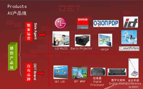 十多年的运营经验,奠定了德浩科技在AV行业的领导者地位。德浩科技的产品包括自主开发的平板拼接显示系统(MPDP等离子拼接显示系统、MLCD液晶拼接显示系统)、固定安装工程投影机、多媒体互动演示系统、以及自主开发的包括多屏处理器、DIV/VGA/VEDIO系列矩阵以及数字会议系统在内丰富的视音频产品线。同时,德浩科技与韩国ORION、比利时Barco、韩国LG、德国ICT等国际知名企业建立了战略合作伙伴关系,是ORION等离子拼接系统、Barco投影机、LG液晶拼接系统,以及ICT smartPerform多媒体互动演示系统在大中华区的独家运营商,确立了德浩科技在国内领先的视频显示系统提供商的品牌地位。