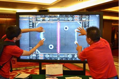 NECV551打造的55寸高端无盲区4CCD技术互动触摸信息交互发布平台,用特殊的优化算法处理,避免了重叠区域误算的风险,极大提升了触屏准确性和反应速度,展会现场双人同屏同时体验触屏游戏,不仅操作无丝毫的延迟感,还能通过NEC的大小屏联动技术,将触摸操控的结果实时显示在3*3大屏幕拼接屏上,快速实现信息共享和实时动态的调用。据悉,NEC将推出一系列具有多点触控功能的工程显示器,该系列产品将采用业内最高端的触控技术,实现至少四点的触控。相信这一系列产品的推出会使得NEC工程显示产品如虎添翼。此外,NEC现有的V系列和P系列工程显示器,在设计之初就已预见到未来趋势,为产品预留了极大的改造空间。现有产品只需经过简单改造便可配合触摸屏实现多点触控,巡展中就是采用V551加装触摸屏来实现的。