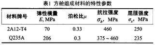 方舱的外蒙皮材料为硬铝合金板2A12-T4,内蒙皮、滑橇材料为冷轧钢板Q235A,由于采取了等刚度变换,内、外蒙皮之间的硬质聚氨酯泡沫塑料不予考虑。材料的特性参数见表1。