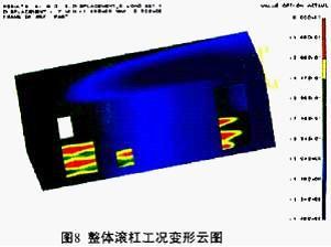 c.整体滚杠工况:其应力图见图7,变形云图见图8。由图7看到,在滚杠过程中,底板的滑橇上产生的应力最大,为225 MPa,虽然也在材料的弹性变形范围之内,但已接近材料的屈服强度,显然是由于滑橇与滚杠接触点处的压强增大所至。由图8看到,在滚杠过程中,最大位移量为1.49 mm,发生在底板上,变形量较小。