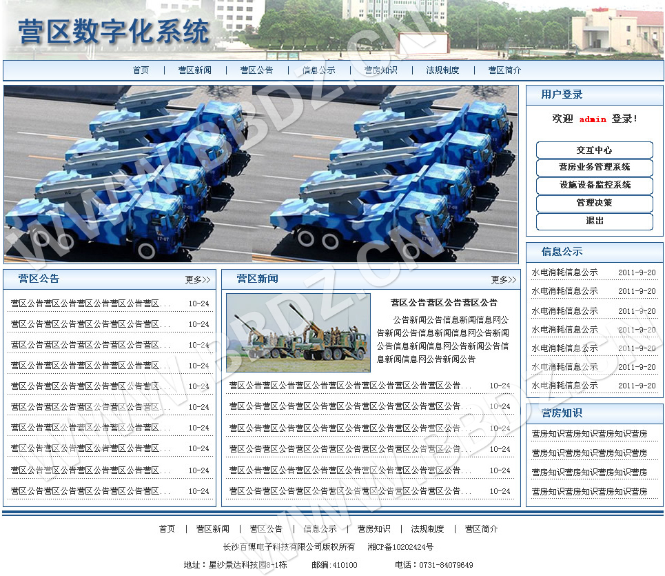 (9)营房服务网站,分为营房服务网站、公用信息界面、管理决策界面、业务处理界面、用户交互界面等构建营房数字化综合管理系统。