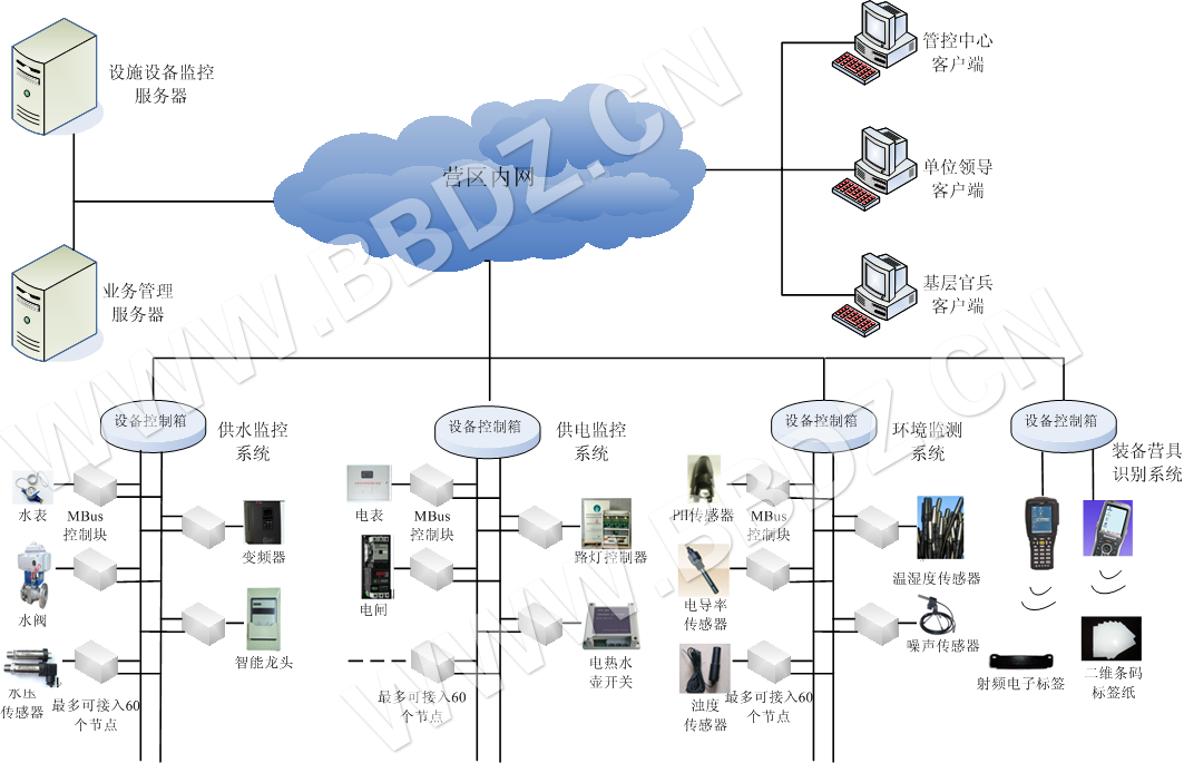 (1)营区物联网,分为营区局域网、营区建设网、设备控制箱、模数转换器等设备数据实时交换。