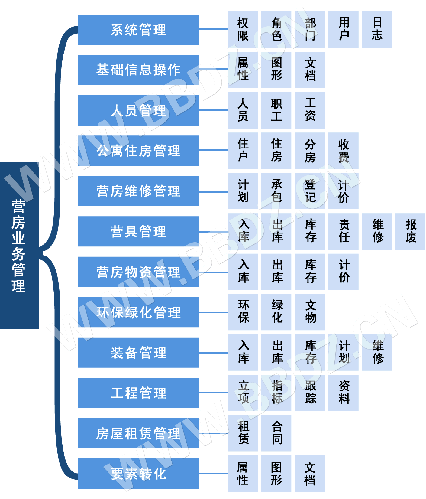 营房业务管理系统的基础信息、人员、住房、装备营具、物资、环保绿化、工程建设等都可在业务管理系统内进行综合管理。同时系统为日常办公提供相关数据的报表打印、输出等功能。结构图如下: