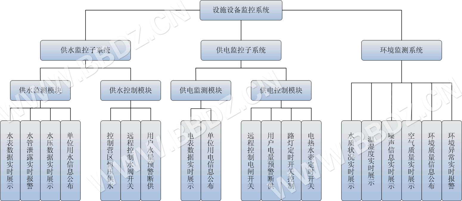 设施设备监控系统主要包括供水监控子系统、供电监控子系统、环境监测子系统三个部分,具体业务功能如下所示: