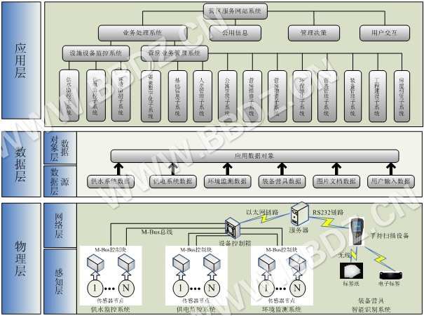 营区数字化系统的网络建设主要是构建营区物联网,营区物联网分为三层,感知层、网络层及应用层。