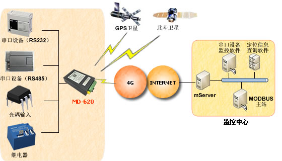 MD-620可以快速与PLC、工控机、仪器、仪表、RTU 等设备相连,通过4G网络将与MD-620相连的设备数据传输到Internet上的一台主机上,实现数据远程透明传输。与此同时可将前端设备所处地的GPS位置信息上报至主机上,实现设备的定位。