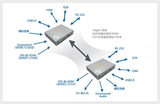 一路光纤/网线支持HDMI 2.0,DisplayPort 1.2,HDCP最高2.2,音频,高速USB 2.0、1GbE控制,RS-232等各类信号同步传输延长。