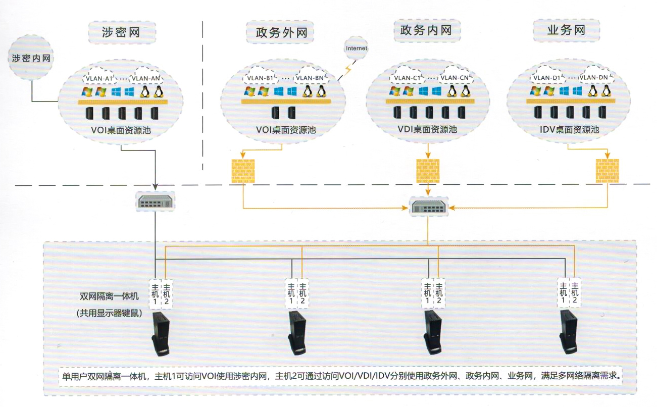 针对数据机密程度极高要求物理隔离、并需要运行高清、3D类大型设计软件、外设繁杂的用户需求,可采用和信双网隔离一体机双网物理隔离方案部署2套物理网络、2套桌面资源池,使用双网隔离一体机,分别访问不同的VOI或VDI国桌面资源,实现彻底的物理隔离。?