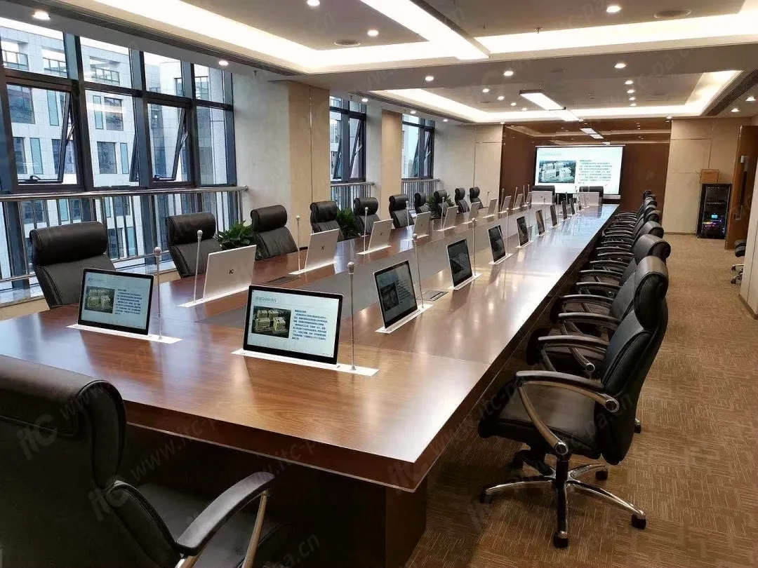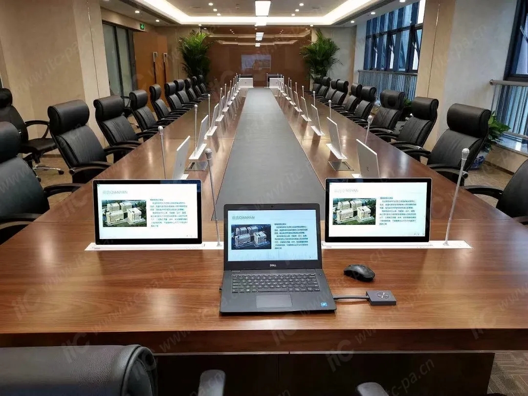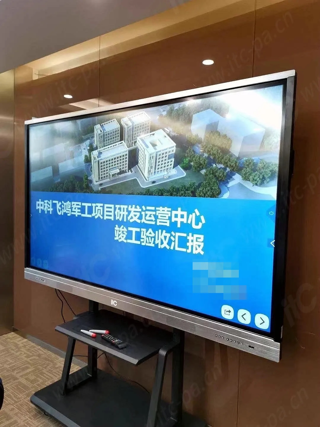 在中科飞鸿科技有限公司的智能会议室建设中,itc为其设计了集无纸化会议系统、专业扩声系统、会议交互智能平板的整体解决方案。