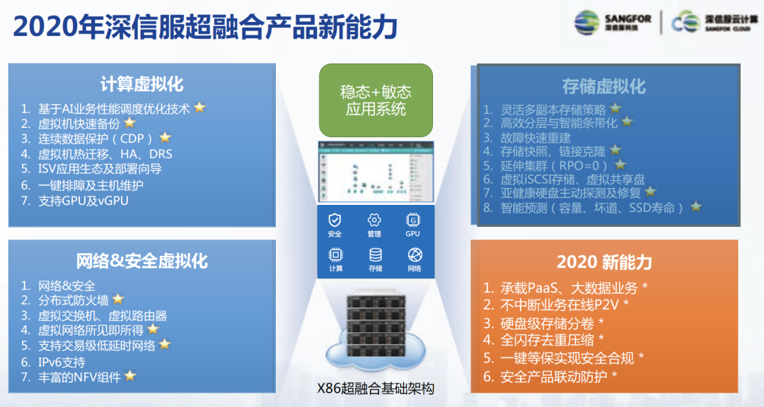与战略升级相匹配的是产品能力的全面提升。深信服过去聚焦打造新型的超融合IT基础架构,去承载用户的敏态应用和稳态应用,现全面升级为独立产品+集成平台的开放式产品体系。