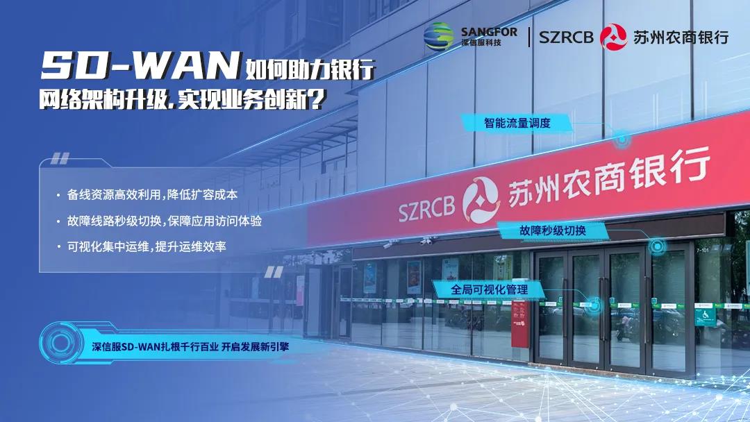 目前,苏州农商行与深信服达成合作,通过部署深信服SD-WAN解决方案,大幅度提升业务访问体验及带宽利用率,可视化运维管理全行广域网,实现网络架构全新升级。