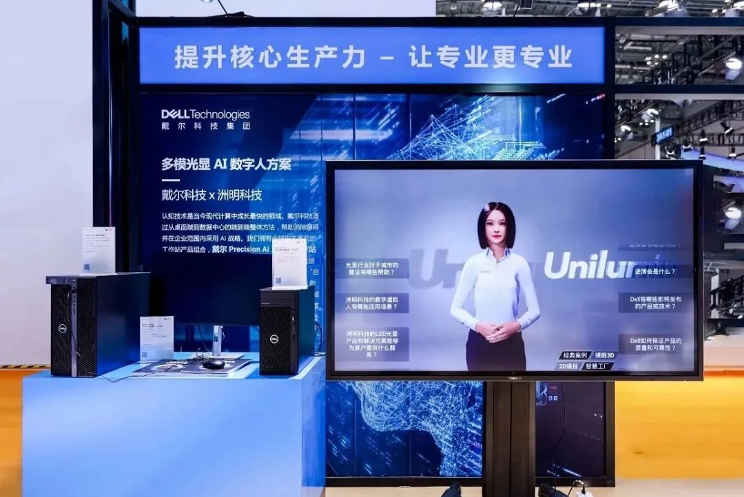此次进博会上,戴尔科技与洲明科技达成战略合作,将洲明科技的优秀解决方案和交付能力,与戴尔Precision工作站的强大性能完美融合,共同打造出多模光显AI数字人应用的多领域应用解决方案。