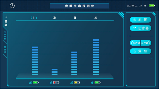通过同一手持控制终端同一操作软件界面实现操作系统的融合,雷达探测信号、微震探测信号的探测结果可以通过无线传输至手持控制终端,可在手持控制终端同一操作系统同一界面实现对雷达主机、无线微震传感器、音视频生命探测唯的无线实时控制、状态显示、数据综合,探测模式可一键切换。