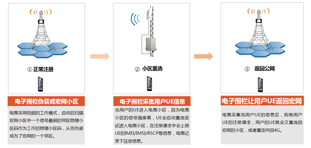 起初“违规手机”处于宏网中,当其进入设备覆盖范围时,设备利用手机的IDLE小区重选机制,可将“违规手机”强制从宏网牵引到设备网络系统上来,同时完成对“违规手机”的IMSI和 IMEI信息的采集,并对连入系统的WIFI 用户获取其手机的MAC地址信息。信息采集完成设备将“违规手机”释放并推送到宏网,并同时将采集到信息发送到指定的后台数据分析服务器。后台服务器根据所获取的信息进行相应的处理及相关功能的实现。