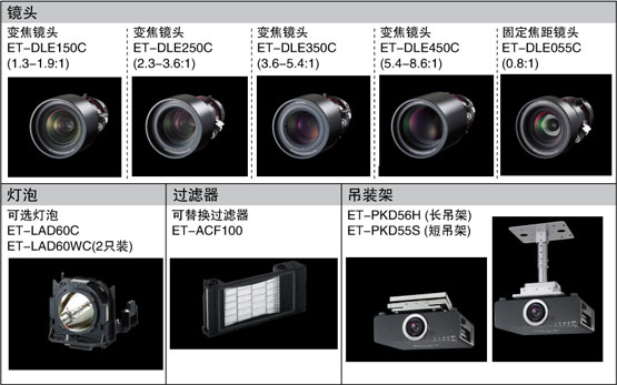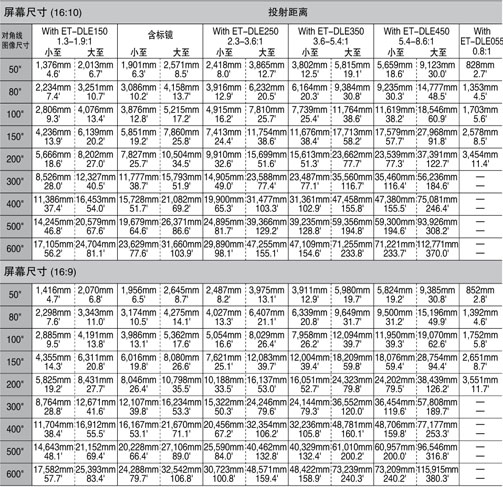 | 屏幕尺寸 | 50-600英寸(选用ET-DLE055C,50-200英寸),16:10宽高比 |