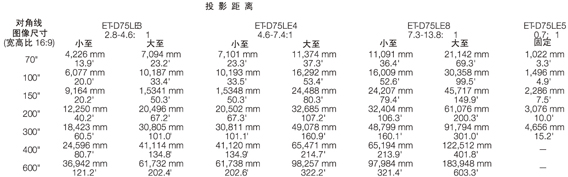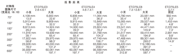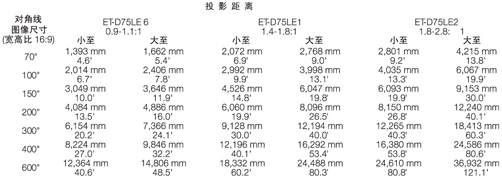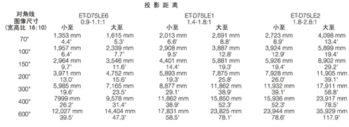 | 屏幕尺寸 | 70-600英寸,16:10宽高比 (选用ET-D75LE5,70-300英寸,16:9宽高比) |