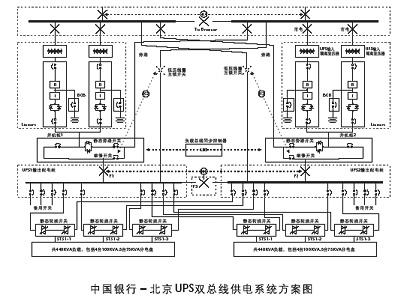 对于特别要求的重要地点可以采用母线双机冗余供电的方式,如中国银行北京的应用方式,如图: