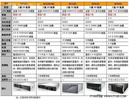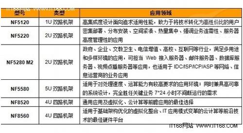 从应用领域上NF8520和NF8560,在基于英特尔QPI技术NEHALEM-EX微架构多路多核处理器设计,强调灵活扩展、适用功能、高性能、高安全,定位于核心业务。强调在虚拟化、云计算平台上的应用。