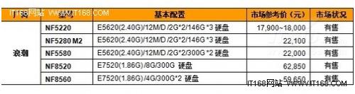 浪潮在2010年7月公布了最新的报价单,从表中可以看到,支持至强5600处理器和至强7500处理器的服务器共有6款,分别是四路机架NF8520、NF8560,双路机架的NF 5120、NF 5220、NF5280M2和NF 5580。