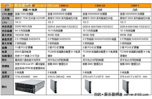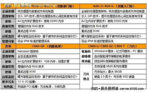 在四路机架中,I840r-GP采用全互连性直连结构,采用了最新四路7500系列多核处理器,可以支持虚拟化。3款刀片CB60-G和CB60-G2、CB60-T分别应用于 TC2600和TC3600服务器机箱中。同样采用至强5600处理器,但在硬盘中以25英寸为主,可以采用SSD硬盘。