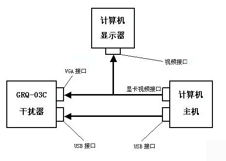 1.当“GRQ-03C计算机相关干扰器”与被保护计算机连接使用时,从计算机主机显卡上拔下显示器视频信号电缆插头并插在“专用视频转接电缆”的 DB15头上,“专用视频转接电缆”的另一DB15头插在计算机主机显卡上,“专用视频转接电缆”的USB头插在干扰器上标有“VGA” 字样的接口上,同时再用附带的USB连接线两端分别连接到计算机USB接口和干扰器上标有“USB”字样的接口即可,如下图所示。
