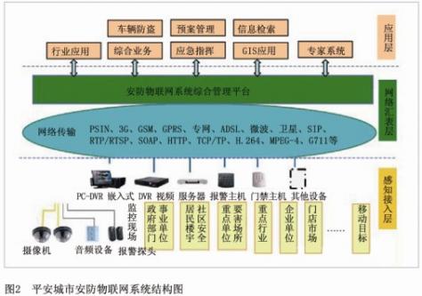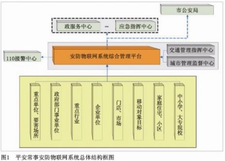 以我们安防物联网建设为例,主要应用于城市综合安全防范,不仅满足城市治安管理、交通管理、应急指挥等需求,也可为灾难事故预警、安全生产监控、重大活动组织管理、天气实时报告、消防管理等诸多行业的经营管理和科学决策提供图像、数据资源信息服务。从应用层面看,该系统主要包括安防物联网系统综合管理平台、城市重点单位、要害部门防控子系统;政府部门、事业单位防控子系统;重点行业、企业单位、商业门店、市场仓库等防控子系统;车辆等移动对象 目标防控子系统、家庭住宅、社区防控子系统和中小学、大专院校综合防控子系统。安防物联网系统综合管理平台还可从交管平台和城管平台获取资源、为110指 挥中心、应急指挥中心、政务服务中心提供服务资源,并为市公安局预留统一交互接口。其总体框图和系统结构图分别如图1和图2所示。