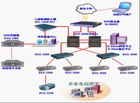 核心层:采用双核心D-Link DES-8500系列万兆路由交换机。DES-8500是大容量、高密度、高性能、模块化核心路由交换机产品,其背板带宽高达32Tbps,包转发速率最大为952Mpps,具备二到四层线速交换能力。可提供10GE、GE、FE等各种丰富的接口模块,并全面支持IPv4、IPv6、MPLS、NAT、组播、QoS、带宽控制等业务功能。整个系统所具备的高可靠性、高扩展性、强大的业务能力等特点完全满足政务内网核心层的建设需求。