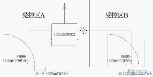 图示2是一台双门控制器用于控制A区、B区的出入门,当设计A区、B区为同一级的受控区,控制器安装在A区或B区都可以。但当要求A、B两区为不同级的独立受控区,控制器不管设计在哪个区都存有安全隐患。这是因为目前的控制器基本都是采用直流或脉冲信号等非编码信号来直接驱动电控锁具的,因此当控制器设计安装在A区,B区就不安全;反之设计安装在B区,A区就不安全。图示2注示※处为最易遭攻击的薄弱点。