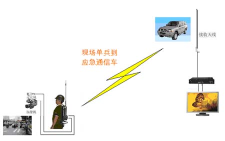 单兵式:当移动通信车到达指定地点后,可以将全向玻璃钢天线立起,另一个单兵端在距车载移动站3~5公里范围内,实现点对点的无线单向图像语音传输。