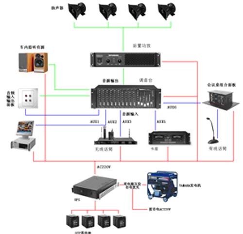 主要由有线话筒、无线话筒、卡座、调音台、大功率功放、强声喇叭和监ting音响组成,音源如有线、无线话筒、计算机、卡座等经调音台进行音调、音亮的调节和输入通道选择后,将放大后的信号推动功放,使功放以足够大的功率向外界播音。同时也可通过车内音响进行监ting。
