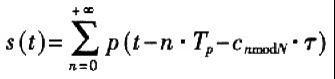 其中p(t)为单个窄脉冲信号,Tp为信号的重复周期,{ci|i=1,2,……N)为伪随机码,NxT为TH-PPM调制时的最大偏移,一般取