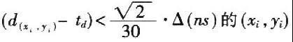 为成像区域中的点坐标,d(xi,yi)为查找表中(xi.yi)点的延时值。两个集合的交集即目标点的准确位置。注意当采用查找表方法时,因为满足条件点不止一个,导致了模糊区域的产生,并且受接收天线之间的距离和目标与天线距离的影响,所以穿墙雷达方位相上的分辨率一般较差。
