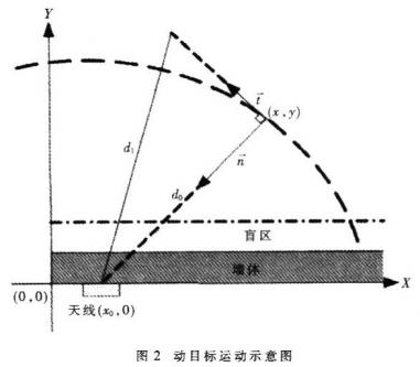 d1随时间t的变化呈直线状。根据动目标径向距离的变化即可推知其运动方向。当需要精确的目标方位角信息时,至少需要两根接收天线,然后利用等距弧线之间的交点即可实现对动目标的定位。