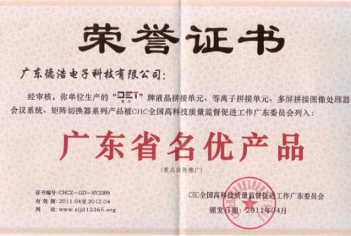 2011年4月,由德浩科技自主开发的DET液晶拼接单元、DET等离子拼接单元、DET多屏拼接图像处理器、DET数字会议系统以及DET矩阵切换器系列产品,被CHC全国高科技质量监督促进工作广东委员会列入重点宣传推广的“广东省名优产品”。该殊荣的获得,标志着德浩科技在自有技术开发与打造自有品牌产品线取得阶段性的突破。