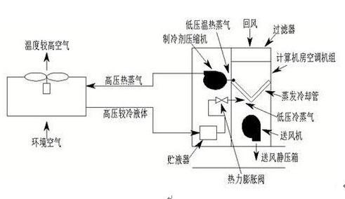 此前我们提到过的风冷精密空调冷却系统,就是专门应用与数据中心的传统冷却系统,它一般采用涡旋压缩机制冷(一般安装在精密空调内),能效比相对比较低,而且还存在安装困难的问题。