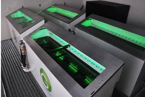 高热密度制冷专家Green Revolution Cooling提出了一种颠覆式的冷却系统方案。该冷却系统要求将机柜平衡放倒在地,然后倒入250 加仑的电介质液体,将服务器垂直插入周围的槽体内,并由连接到商用蒸发式冷却塔上的热交换器来控制液体的温度。该液体容器是由3英寸厚的角钢制成,每个容器里都装有液体液位检测传感器,冷却液体水位反生变化时会立即报警。