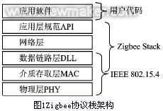 Zigbee技术并不是完全独有、全新的标准。它的物理层、MAC层和链路层采用了IEEE802154(无线个人区域网)协议标准,但在此基础上进行了完善和扩展。其网络层、应用会聚层和高层应用规范(API)由Zigbee联盟进行了制定,整个协议架构如图1所示。