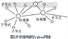 Zigbee是以一个个独立的工作节点为依托,通过无线通信组成星状、片状或网状网络,因此,每个节点的功能并非都相同。为降低成本,系统中大部分的节点为子节点,从组网通信上,它只是其功能的一个子集,称为精简功能设备;而另外还有一些节点,负责与所控制的子节点通信、汇集数据和发布控制,或起到通信路由的作用,称之为全功能设备(也称为协调器),如图2所示。