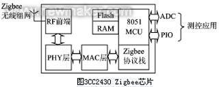 Chipcon公司推出的高度整合的系统级射频收发器CC2430,如图3所示,集成了RF前端、128 KB闪存、8 KB RAM以及8051八位MCU核;另外还集成了模数转换器(ADC)、定时器、AES128协同处理器、看门狗、32 kHz晶振休眠定时器、上电复位和掉电检测电路,以及21个可编程I/O引脚。使这款产品就是一个具备Zigbee功能的SoC,可用于各种Zigbee无线网络节点,包括协调器、路由器和终端设备等。