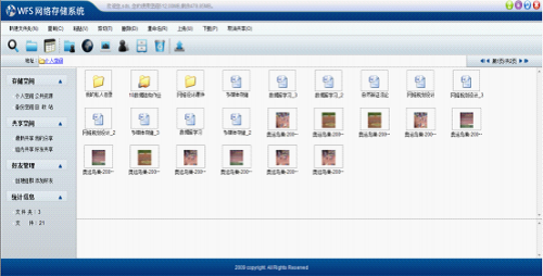 WFS提供文件的在线存储服务,通过浏览器,用户可以在线完成文件的存取和编辑。无论何时何地,只要通过网络访问WFS,就能顺利进行文件存取操作。在WEB页面上,支持快捷键和鼠标右键、拖拽进行文件操作,所有操作像在Windows环境下一样方便。同时支持多文件上传,支持断点续传。支持多文件下载和迅雷下载。基于虚拟化实现文件组织和可视化功能,让用户在浏览文件夹时更方便的找到需要的数据。操作界面如下图: