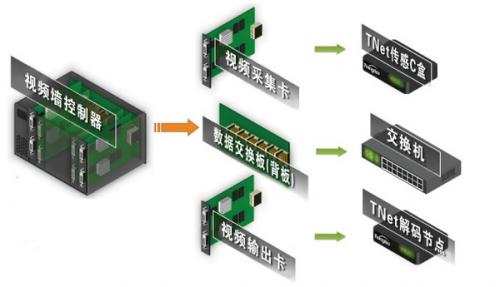 传统视频墙包括:视频采集卡、数据交换板、视频输出卡,主要采用集中控制系统,视频源经视频墙控制器处理后,传送并显示到视频墙上。TNet将其进行革命性提升,分别替换成TNet传感C盒、交换机、TNet解码节点,其中TNet解码节点融入TNet拼接单元中,极大的增强了大屏幕拼接系统的稳定性并降低了客户后期维修成本。
