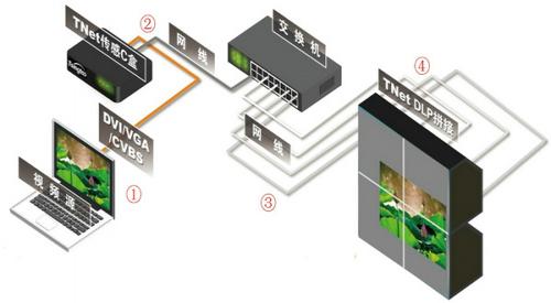 在广电行业应用上,清投视讯TNet“物联网 拼接系统”将视频源通过各种视频线(DVI/VGA/CVBS)连接到TNet传感C盒;然后TNet传感C盒对图像进行处理编码并通过网线传送到交换机上;每一个TNet DLP拼接单元都通过独立的网线连接到交换机上;最终视频解码并显示在TNet DLP拼接单元上。