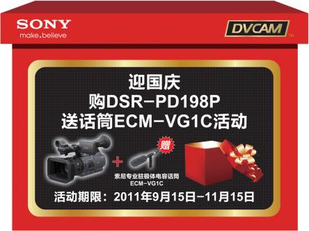 索尼中国专业系统集团为了回馈广大专业视频制作人长期以来对索尼产品的支持和信任,特在 BIRTV'2011展览之后,从2011年9月15日至11月15日, 开展为期2个月的“DSR-PD198P迎国庆附件回馈”活动在此期间,凡购买DSR-PD198P的客户均可免费获赠价值千元以上的索尼专业驻极体电容话筒ECM-VG1C