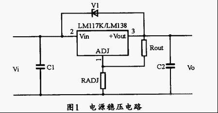 需要说明的是,图1中的稳压器管脚电压差Vo-Vi应在3-35 V范围内,超出范围将不稳压;LMll7K的额定电流为1.5 A,LMl38K的额定电流为5 A;这两个器件的两者管脚定义相同;为保证稳压器正常工作,设计时可选用0.25 W电阻ROUT,其值可选120Ω~240Ω。