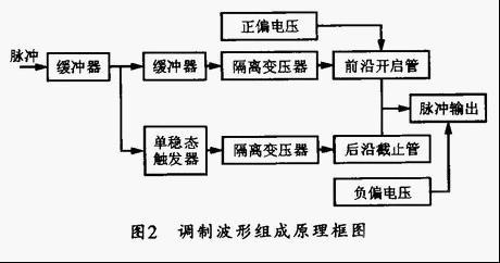 本调制器的组成原理框图如图2所示。图中,当定时脉冲输入到来时,经过缓冲器驱动后,该脉冲将分成两路,分别提供给调制脉冲前沿开启和后沿截止MOS管。其中前沿开启脉冲经缓冲器驱动和三极管放大后,加到隔离升压变压器,以保证高速开启管正常开启;而后沿截止脉冲则使用后沿触发的单稳态触发电路形成,以保证形成的调制脉冲的宽度与定时脉冲的宽度一致。