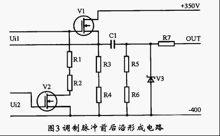 本调制器的调制脉冲前后沿形成使用的是BUZ50B,当Ui2使得V2导通时,负偏电压将使V1迅速截止。这样形成的调制脉冲就能够具有非常良好的后沿波形。其电路图如图3