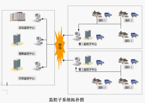 总控中心由网络监控管理中心(RNSS)、电视墙和音响系统构成。总控中心根据需要,能够直接控制营或连队监控系统,进行音视频预览、历史资料检索回放和镜头云台控制等。也可以对现场全程录像,并能够事后查询。