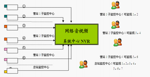 包括用户可登录的网络视音频终端(NVC)、可访问的网络视音频服务器(NVR)、预览的画面和声音、录象资料的检索和下载、云镜控制权及级别。