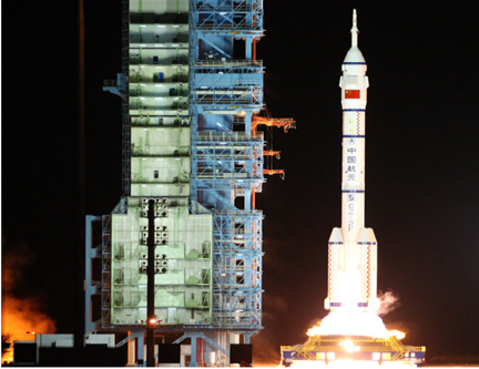 北京时间2011年11月1日清晨5时58分07秒,伴随着零号指挥员的指令,中国“长征二号F”遥八运载火箭在酒泉卫星发射中心载人航天发射场点火发射,火箭飞行583秒后,将“神舟八号”飞船成功送入近地点200公里、远地点330公里的预定轨道。